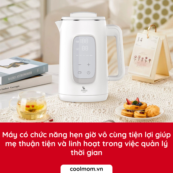 Chức năng này chỉ sử dụng với chế độ đun sôi. Bố mẹ bấm nút nguồn để mở máy. Bấm nút chức năng 5 lần ( Boil và Timer sáng nhấp nháy đồng thời). Khi đó màn hình hiển thị mặc định 1 giờ. Bố mẹ có thể bấm + hoặc – để chọn thời gian hẹn giờ đun sôi sau 1,2,3,4 hoặc 5 tiếng.