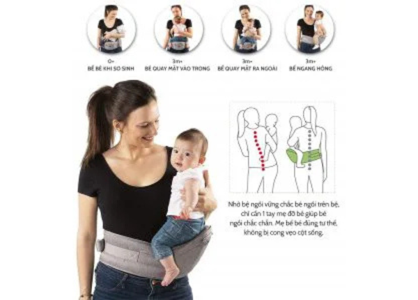 • Nhờ bệ ngồi, trọng lượng của bé được phân tán lên hông của ba/mẹ, bé ngồi thoải mái trong khi đó tư thế bế của ba/mẹ không ảnh hưởng lên xương sống, trọng lực cũng được giảm bớt.