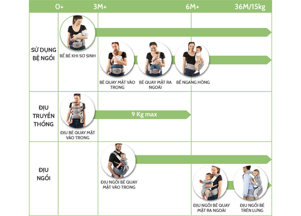 • Địu ngồi đa năng: Với các bé từ 3 tháng, bé địu úp mặt vào trong giống như địu truyền thống. Khi bé ngoài 6 tháng có thể địu bé hướng mặt ra ngoài, hoặc địu sau lưng nhờ bệ ngồi vững chãi giúp bé có điểm tựa chắc chắn nên hoàn toàn AN TOÀN.