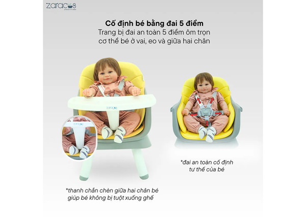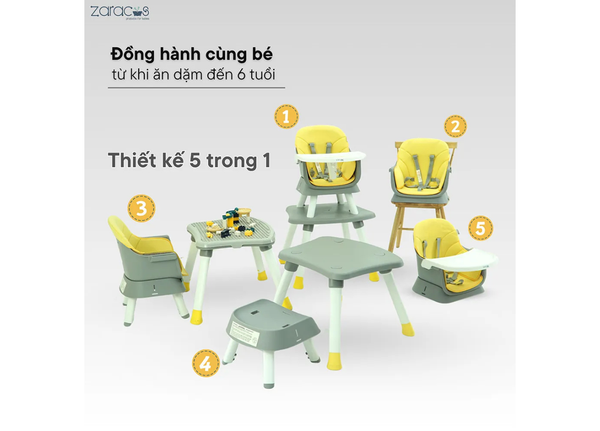 Zaracos Leeroy 3306 là sự lựa chọn kinh tế và thông minh dành cho các bậc phụ huynh hiện đại. Nhờ thiết kế 5 trong 1 linh hoạt, sản phẩm dễ dàng chuyển đổi phù hợp với từng giai đoạn phát triển của bé – từ lúc bắt đầu ăn dặm cho đến 6 tuổi.