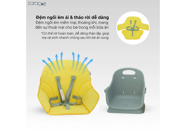 Đệm ngồi êm mềm, thoáng khí, mang đến sự thoải mái cho bé trong mỗi bữa ăn. Có thể rời hoàn toàn, dễ dàng tháo lắp, giúp mẹ vệ sinh nhanh chóng sau khi bé ăn xong – đảm bảo luôn sạch sẽ và an toàn cho làn da nhạy cảm của bé.