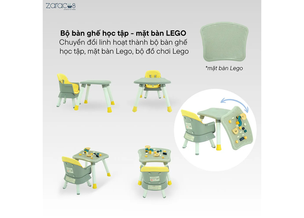 Một điểm cộng nổi bật của ghế ăn Zaracos Leeroy 3306 chính là khả năng chuyển đổi linh hoạt thành bộ bàn ghế học tập – vẽ tranh nhỏ gọn, xinh xắn.