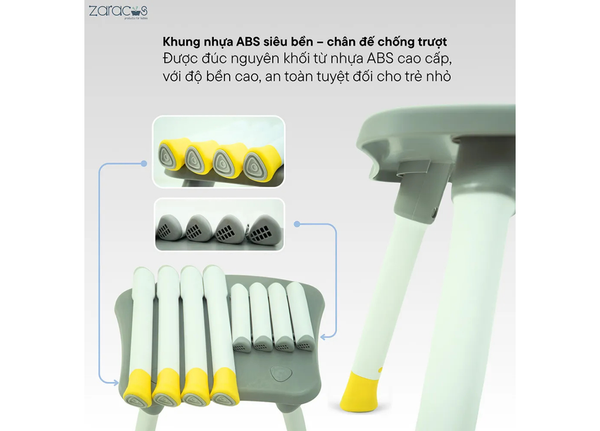 Khung ghế ănZaracos Leeroy 3306 được đúc nguyên khối từ nhựa ABS cao cấp, nổi bật với độ bền cao, chịu lực tốt và đặc biệt an toàn tuyệt đối cho trẻ nhỏ. Chất liệu này không bị biến dạng dưới nhiệt độ cao, không phản ứng với các chất tẩy rửa, giúp ghế luôn bền đẹp và dễ vệ sinh sau thời gian dài sử dụng.