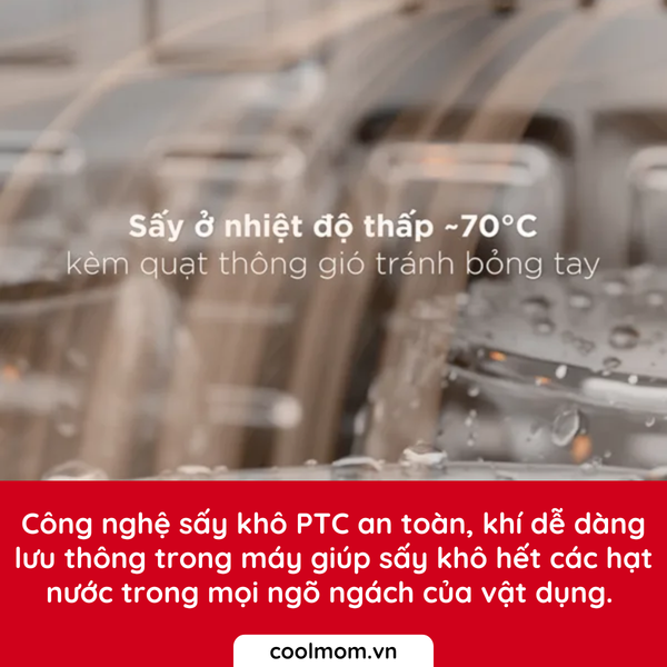 - Sấy khô ở nhiệt độ thấp (~70ºC) bằng máy phát nhiệt PTC và quạt thông gió để tránh bỏng tay.