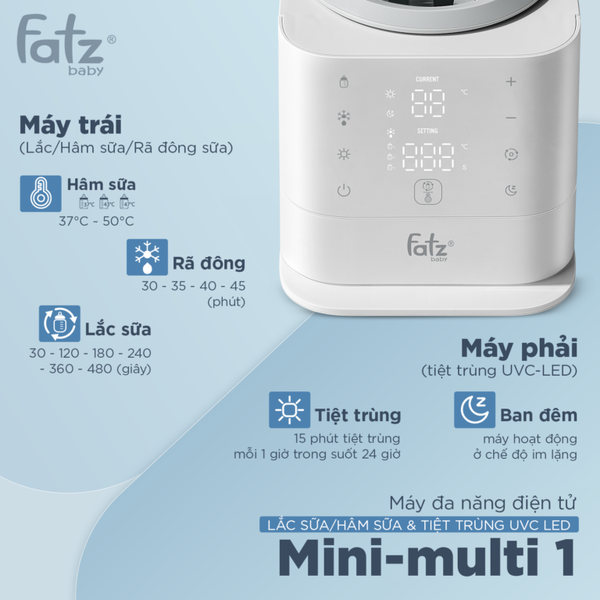 Bên cạnh việc hâm sữa, tiệt trùng núm ti cũng vô cùng quan trọng. Mini-Multi 1 tích hợp máy tiệt trùng UVC LED mạnh mẽ, giúp loại bỏ vi khuẩn chỉ trong vài phút. Máy được trang bị 2 hạt UVC-LED công suất cao, đảm bảo tiệt trùng hiệu quả không chỉ cho bình sữa mà còn cho núm ti, đồ chơi, đồ gặm nướu, thậm chí cả trang sức của mẹ.