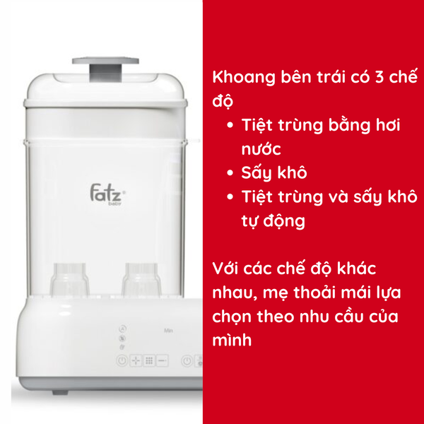 - Công suất máy bên trái: 500 W (tiệt trùng) + 115W (sấy khô)