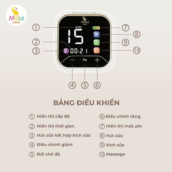 MB – 094 có đến 3 cấp độ Kích sữa, 10 cấp độ Massage xoa bóp bầu ngực, giúp mẹ thả lỏng cơ thể, cùng với 15 cấp độ điều chỉnh hút sữa để mẹ dùng sao cho phù hợp nhất. Đồng thời có thể điều chỉnh 12 cấp độ hút sữa kết hợp kích sữa, bắt chước tốc độ nhịp bú của bé.