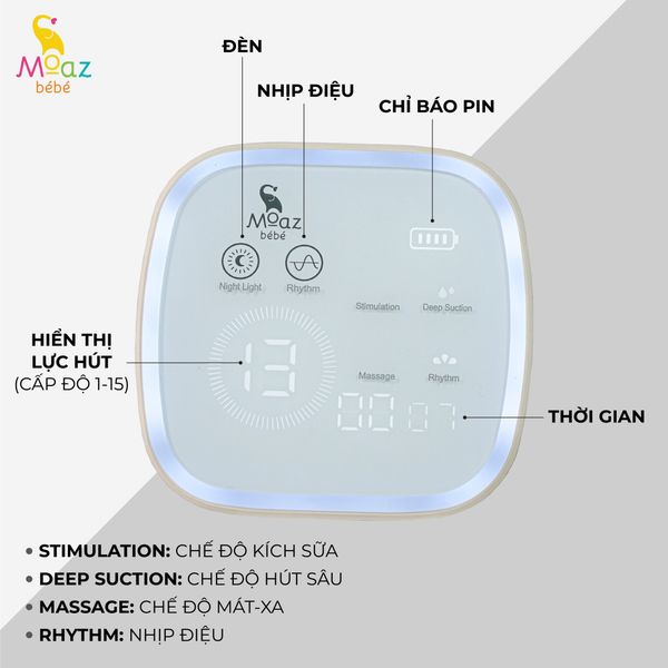 Chế độ hút sữa Mô phỏng nhịp bú tự nhiên của trẻ | 15 cấp độ |