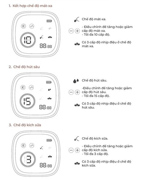 Có 3 cấp độ trong chế độ kích sữa, nhằm kích thích mẹ tiết sữa.