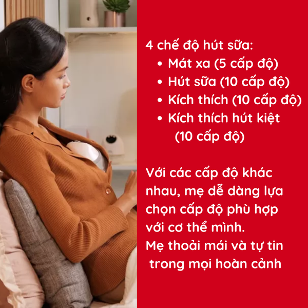 - Gồm 4 chế độ: Mát xa (5 cấp độ) và Hút sữa, Kích thích, Hút kiệt (10 cấp độ).
