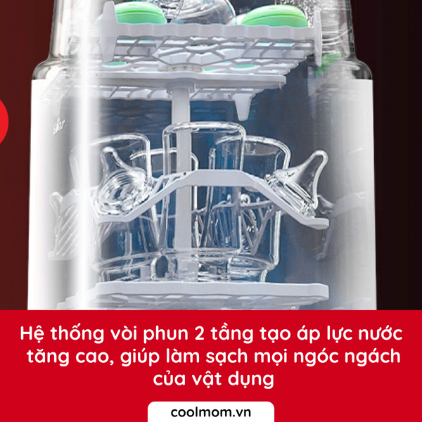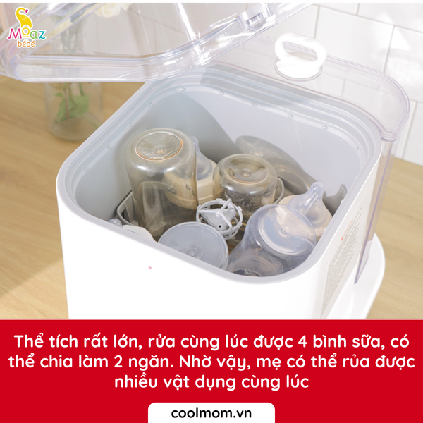 - Khoang rửa bình lớn rửa cùng lúc 4 bình sữa
