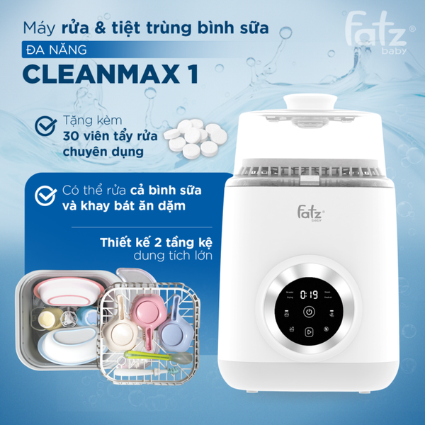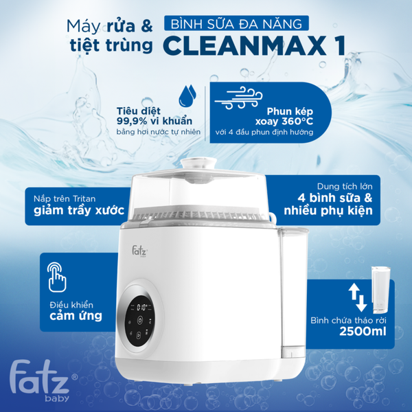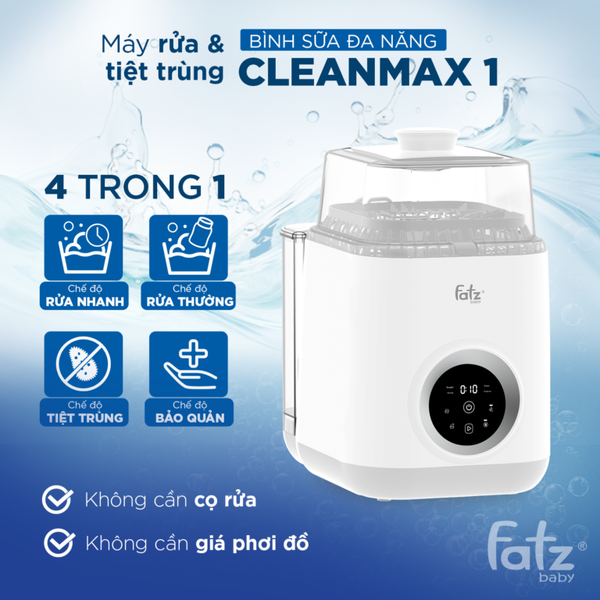 Việc rửa bình sữa chưa đúng cách có thể dẫn đến nhiều nguy cơ như rối loạn tiêu hóa, kém hấp thu và các bệnh lý khác ở trẻ. Cleanmax 1 giúp bố mẹ loại bỏ hoàn toàn những lo lắng này nhờ khả năng tự động rửa, tiệt trùng và sấy khô bình sữa, núm ti và các phụ kiện của máy hút sữa. Thấu hiểu điều này, Fatzbaby mang đến trợ thủ Máy rửa và tiệt trùng bình sữa đa năng Cleanmax 1, tích hợp tất cả các tính năng mẹ cần cho một chu trình làm sạch bình sữa hoàn hảo: rửa bình, tiệt trùng, sấy khô và bảo quản!