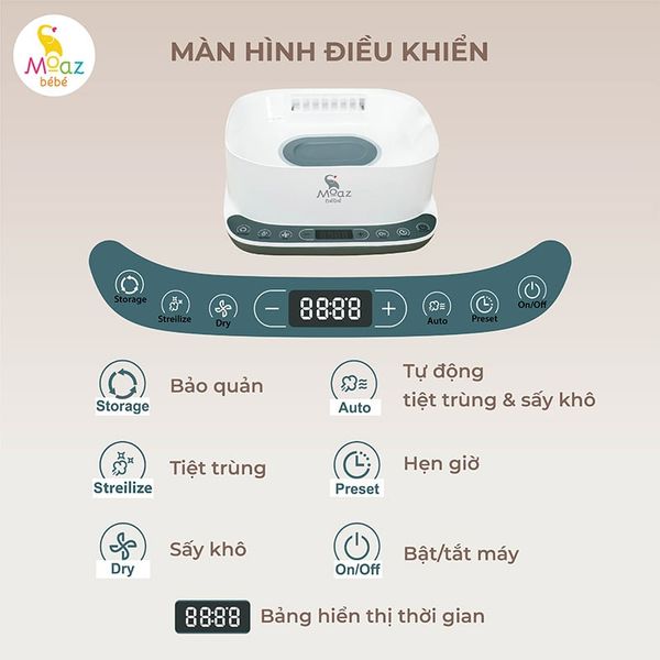 Sản phẩm được trang bị chức năng bảo quản tự động, giữ cho bình sữa ở môi trường sạch sẽ. Thời gian bảo quản lên đến 24 giờ. Cùng với đó là chức năng hẹn giờ để tự động tiệt trùng hoặc sấy khô theo nhu cầu.