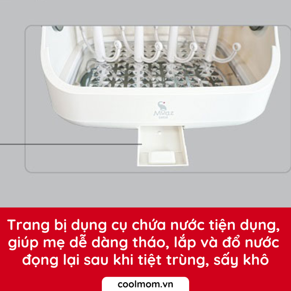 Khay chứa nước giúp mẹ dễ tháo đổ vệ sinh nước đọng lại sau khi tiệt trùng, sấy khô.