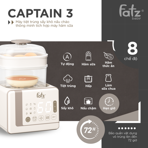 Bạn có tin chỉ với 1 chiếc máy, mẹ có thể thay thế đến 8 thiết bị khác? 🚀 Captain 3 tích hợp Tiệt trùng – Sấy khô – Hấp thực phẩm – Hâm sữa – Hâm thức ăn – Nấu chậm – Làm sữa chua – Chế độ tự động. Không còn tốn kém mua nhiều máy cồng kềnh, giờ đây mẹ chỉ cần 1 thiết bị duy nhất để chăm sóc bé yêu trọn vẹn từ A-Z!