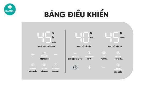 Đun sôi/ Khử clo: Chọn phím Boil/ Anti-Clo. Khi đun sôi, màn hình hiển thị nhiệt độ cài đặt mặc định là 100°C. Sau khi đun sôi, máy sẽ sẽ chuyển qua khử Clo và màn hình hiển thị số 5 phút (tức là khử Clo trong 5 phút). Sau khi hoàn thành, máy chuyển sang Keep Warm. Máy giữ ấm ở nhiệt độ mặc định 45 độ C (nhiệt độ này có thể thay đổi bằng cách ấn +/-).