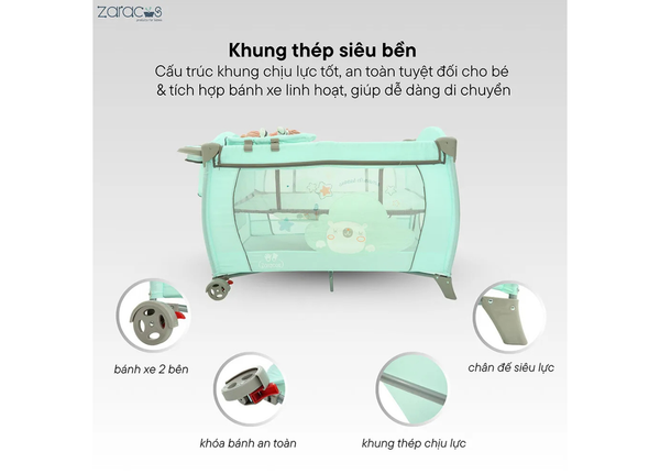 Cấu tạo từ khung thép cao cấp, chắc chắn và bền bỉ theo thời gian. Cấu trúc khung chịu lực tốt, đảm bảo an toàn tuyệt đối cho bé dù nằm ngủ hay vui chơi trong nôi.