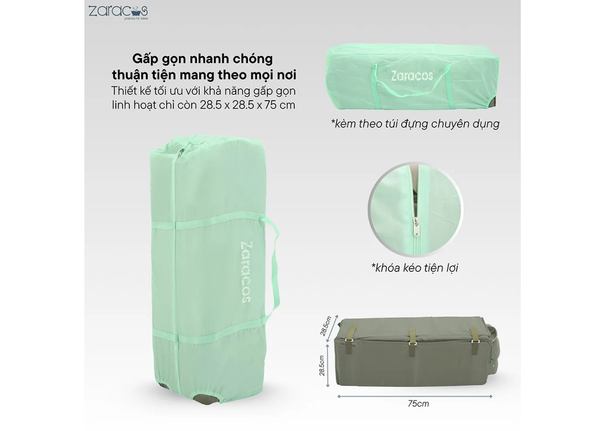 Nôi Zaracos Jenni 5046 được thiết kế tối ưu với khả năng gấp gọn linh hoạt chỉ còn 28.5 x 28.5 x 75 cm, giúp tiết kiệm không gian tối đa khi không sử dụng.