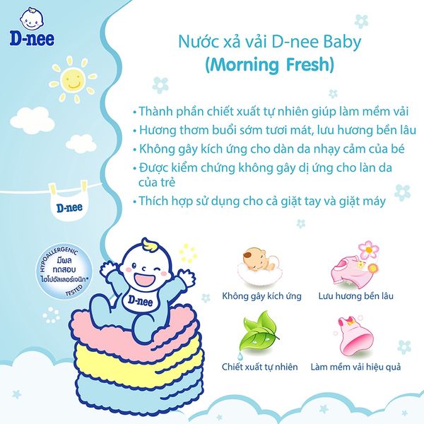 Nước giặt quần áo em bé DNee Morning Fresh được chế tạo bởi công thức đặc biệt đánh bật các vết bẩn và Polyalate sẽ ngăn chặn vết bẩn quay trở lại mà không gây kích ứng làn da nhạy cảm của bé.