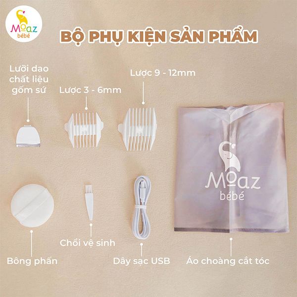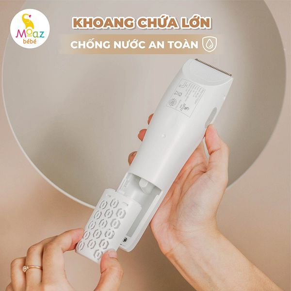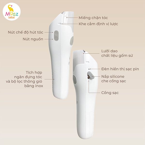 Tông đơ điện cắt tóc cho bé Moaz BéBé MB – 100 giúp bố mẹ tự tay cắt tỉa tóc tại nhà cho bé, để bé yên tâm và không quấy khóc khi đến nơi lạ. Thiết kế tông đơ thông minh, tự động hút tóc, kiểu dáng nhỏ gọn, hoạt động với tiếng ồn thấp, dễ dàng thay thế pin, đem lại sự tiện lợi cho bố mẹ và giúp con không con sợ hãi.