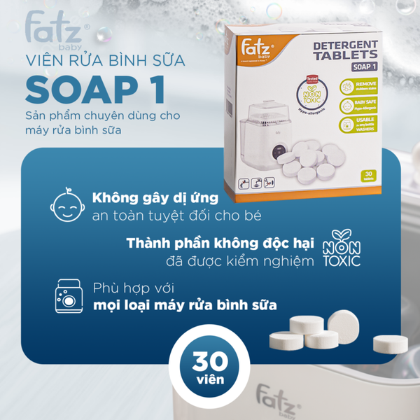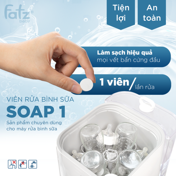 Viên rửa bình sữa Soap 1 là giải pháp hoàn hảo giúp mẹ dễ dàng làm sạch bình sữa, phụ kiện máy hút sữa, bát đĩa ăn dặm của bé một cách an toàn và hiệu quả với công thức đặc biệt không chứa hóa chất độc hại, không gây dị ứng, an toàn cho bé.