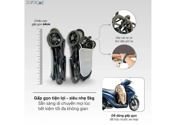 Dễ dàng mang theo bằng xe máy hoặc xếp gọn trong túi đựng xe đẩy Zaracos Indigo 0336 (bán riêng) – tối ưu không gian và linh hoạt tuyệt đối. Nhẹ, nhỏ gọn nhưng vẫn đảm bảo đầy đủ tiện nghi.