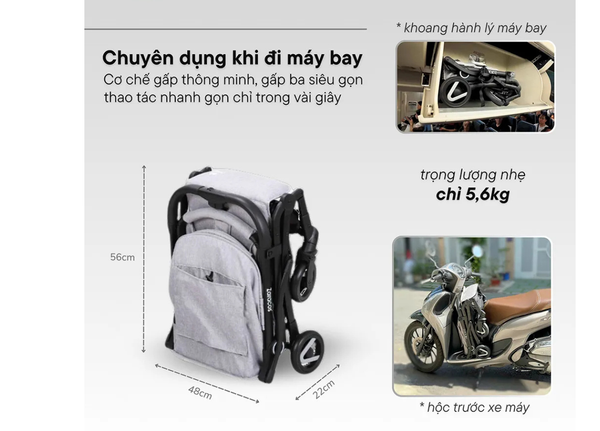 Cơ chế gấp ba thông minh, thao tác nhanh gọn chỉ trong vài giây. Sau khi gấp, xe có kích thước chỉ 48 x 56 x 22 cm và trọng lượng nhẹ chỉ 5,6kg – dễ dàng xách tay lên máy bay, mang theo khi du lịch hoặc để vừa phía trước xe máy
