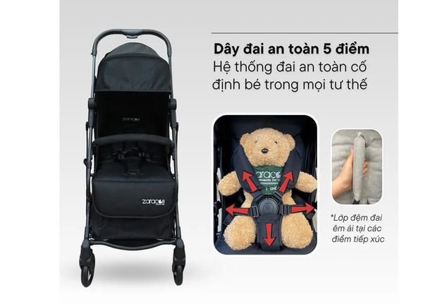 Hệ thống đai an toàn 5 điểm chắc chắn, giúp cố định bé an toàn trong mọi tư thế. Đai có lớp đệm êm ái tại các điểm tiếp xúc, không gây hằn hay khó chịu cho bé khi sử dụng.